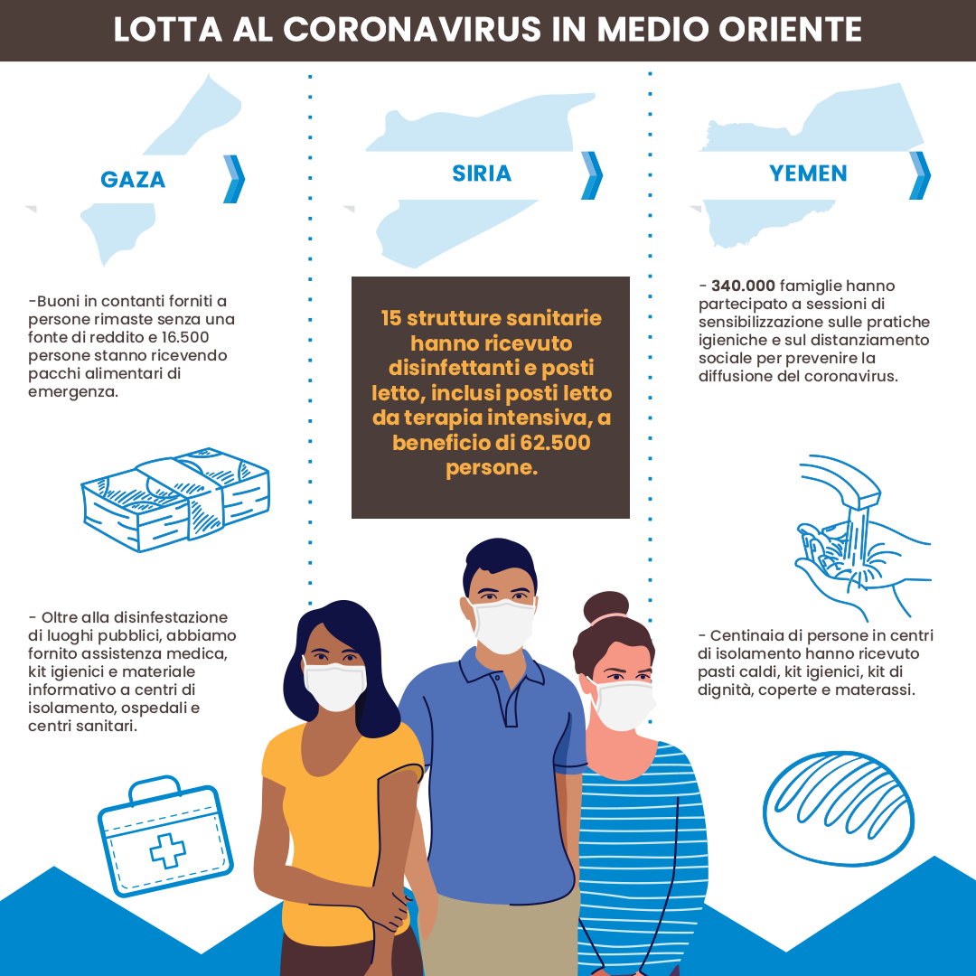 Dall’inizio della crisi fino ad oggi, i nostri team hanno lavorato senza sosta, riuscendo ad assistere più di 4 milioni di persone in più di 30 paesi in tutto il mondo. La nostra risposta ha incluso la distribuzione di pacchi alimentari e prodotti per l’igiene, nonché attrezzature mediche e DPI per il personale sanitario e per gli operatori umanitari. Abbiamo supportato le autorità locali con test diagnostici e nelle fasi di quarantena, mentre preparavamo le comunità a proteggersi al meglio da questo virus per molti fatale.