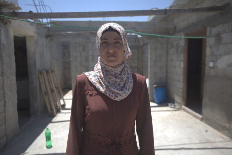 Nel recente bombardamento di Gaza, ho dovuto fuggire da casa nostra. I miei figli ed io tremavamo di paura. Abitiamo sul tetto ora, in una casa composta da due stanzette, il soffitto è in lamiera. Grazie ad Allah, siamo riusciti a scappare di casa. Quando i bombardamenti sono cessati, siamo rientrati, ed ho scoperto che le lamiere erano cadute per l’intensità dei bombardamenti. A quel punto non riuscivo più a stare in piedi, mi limitavo a sedermi per terra. So che se fossimo stati a casa, avremmo perso la vita. La sensazione peggiore è che non ti senti al sicuro a casa tua a causa dei bombardamenti, e sappiamo che la nostra casa non è in grado di proteggerci.