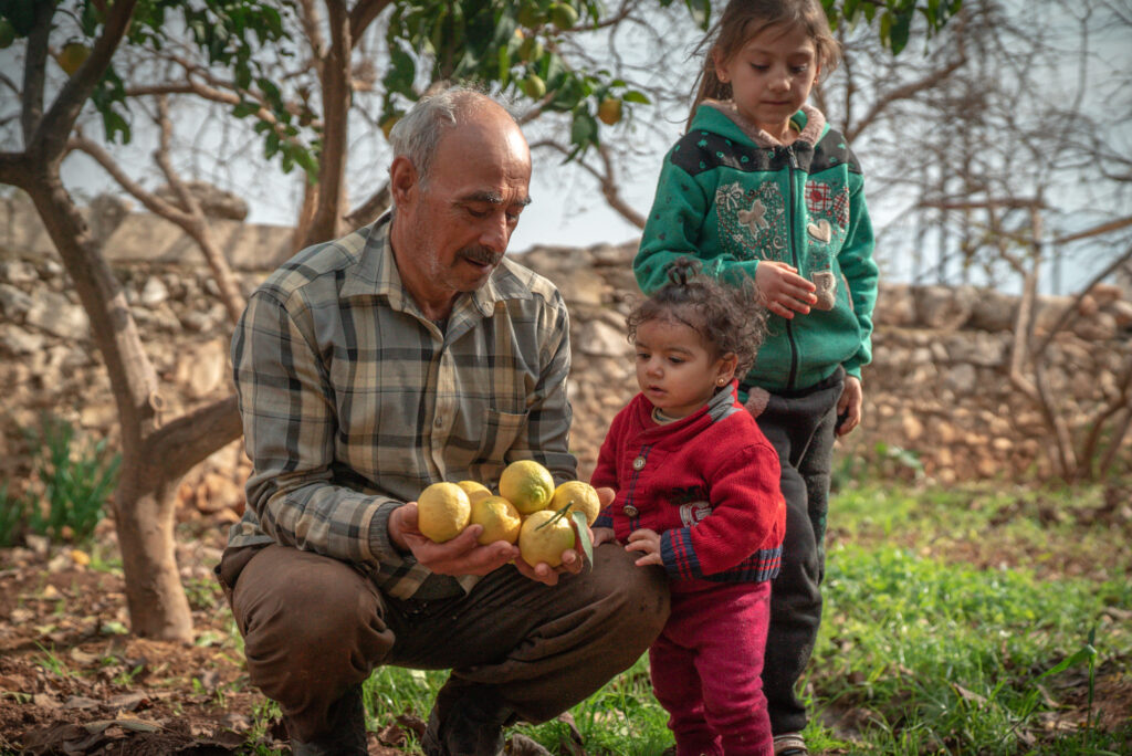 Mustafa mostra ai suoi figli i limoni che ha coltivato usando l’acqua delle strutture fornite da Islamic Relief.