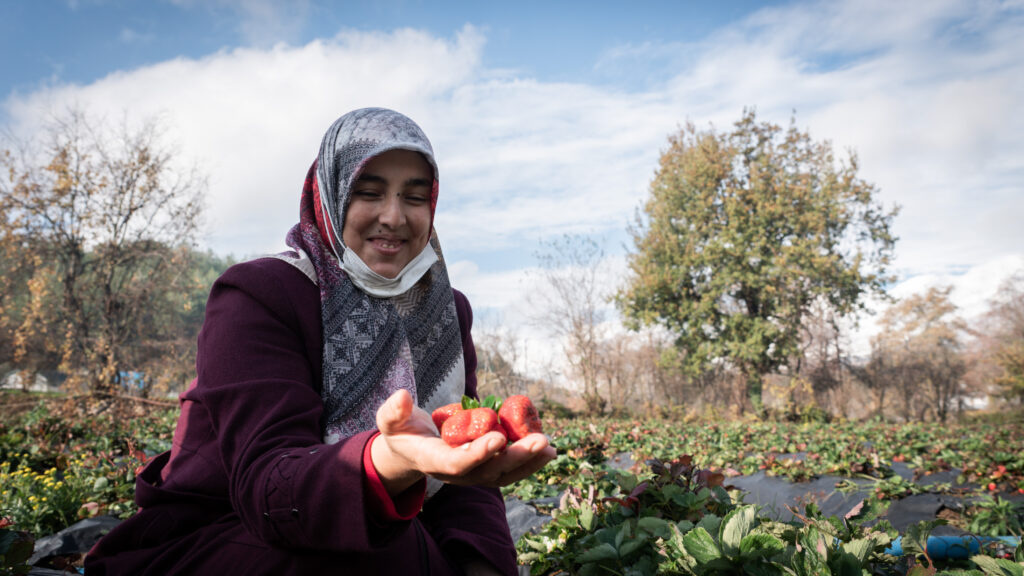 Hana si prende cura delle fragole coltivate dopo aver ricevuto la formazione e le attrezzature da Islamic Relief