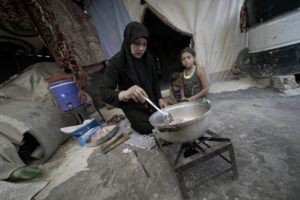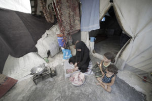 Um Yousef è vedova, vive in un campo profughi con due bambini piccoli e fa affidamento sugli aiuti umanitari per riuscire a sopravvivere.