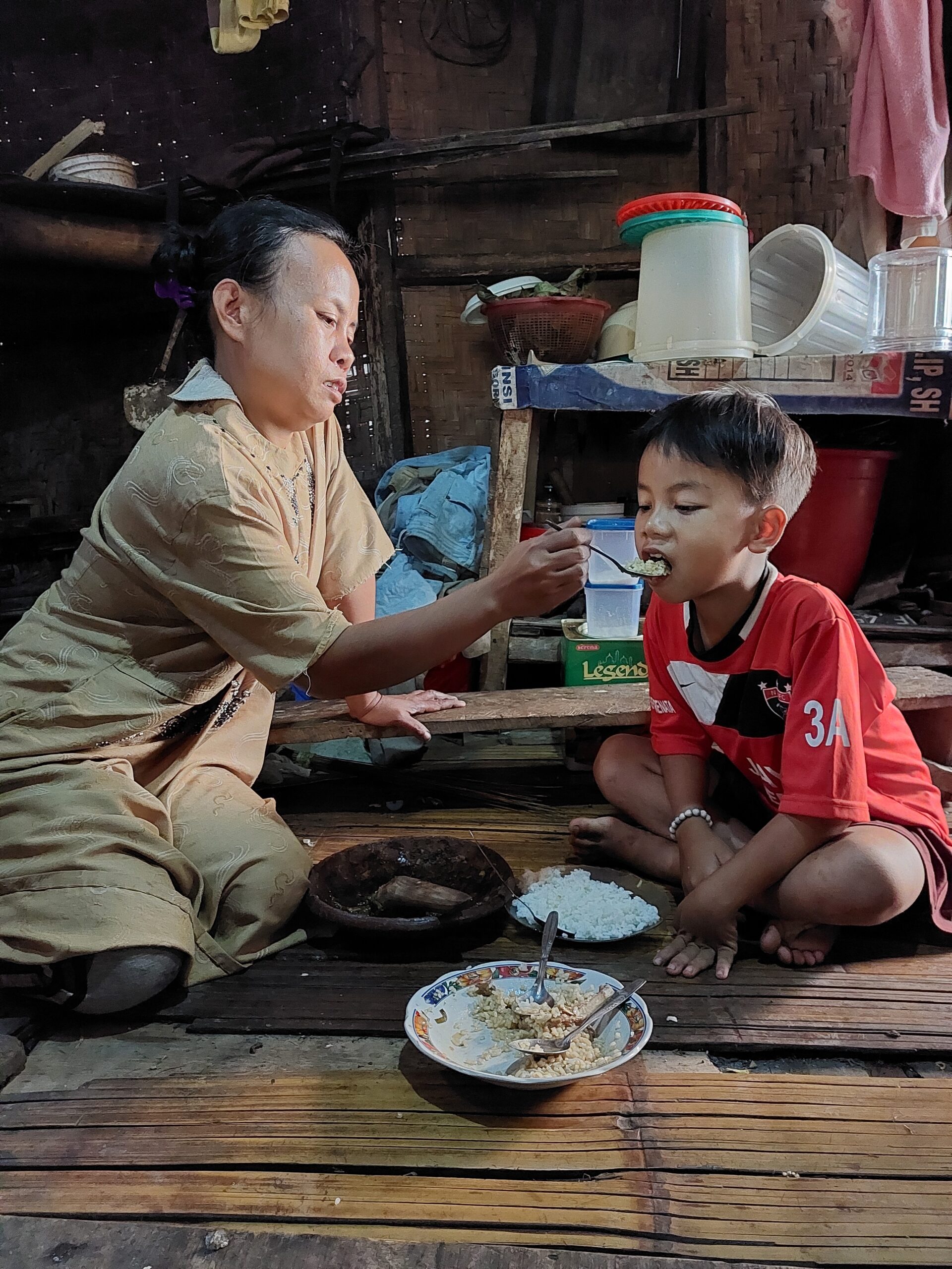 dice, spiegando che la famiglia in genere mangia riso con pesce fermentato o soia. Quando non può permettersi di comprare qualcosa da abbinare al riso, lo mangiano con sale o pasta di gamberetti.